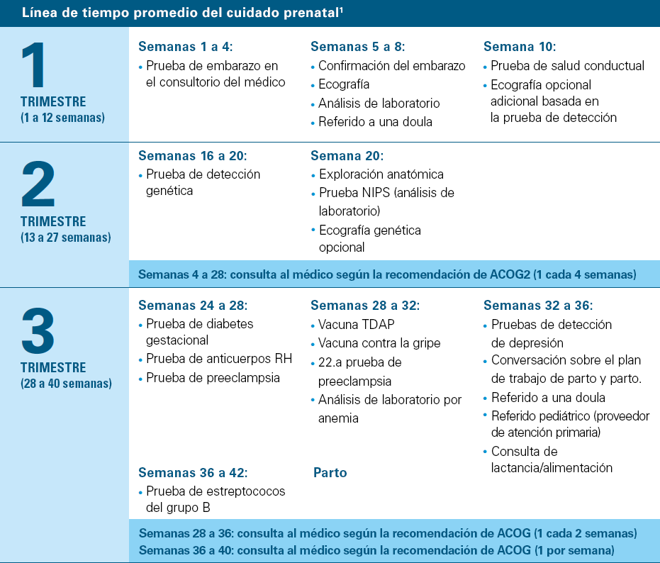 1Fuentes: https://www.mayoclinic.org/healthy-lifestyle/pregnancy-week-by-week/basics/healthy-pregnancy/hlv-20049471; https://www.mayoclinic.org/healthy-lifestyle/pregnancy-week-by-week/in-depth/prenatal-testing/art-20045177; https://www.acog.org/womens-health/infographics/prenatal-genetic-testing-chart; https://www.acog.org/womens-health/faqs/routine-tests-during-pregnancy.